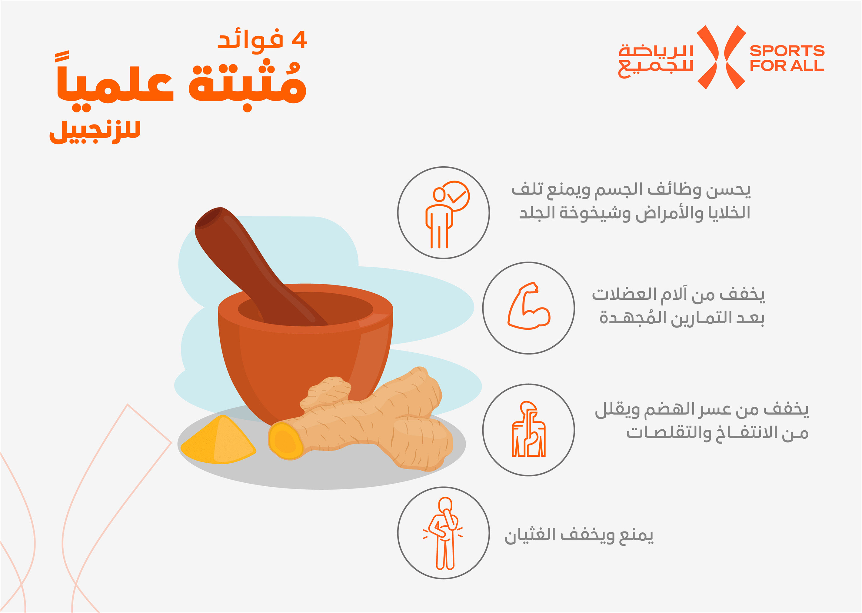 بعد القيام بتمارين رياضية مكثفة، قد تشعر عضلات الجسد بالألم والتعب. لماذا ؟ لأن العضلات تطلق العديد من المستقلبات في الأنسجة المحيطة بالخلايا العضلية، مما يؤدي إلى الالتهاب. (راجع دليلنا حول طرق تخفيف ألم العضلات على هذا الرابط). ويمكن أن تكون خصائص الزنجبيل المضادة للالتهابات فعالة في التعامل مع هذه الالام وتخفيفها. وجدت بعض الدراسات أن استخدام الزنجبيل موضعياً يمكن أن يكون فعالاً للغاية في تخفيف الألم.