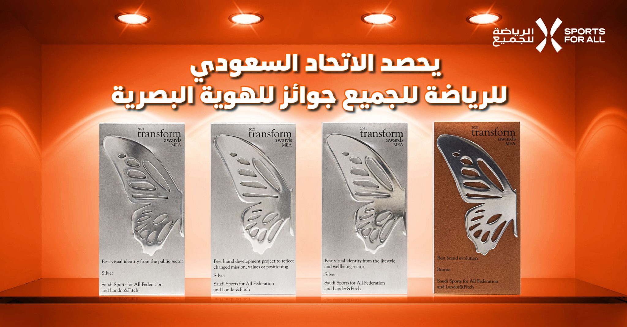 تم تنظيم حفل التتويج الذي في 24 مايو الماضي في مدينة دبي، الإمارات العربية المتحدة. حيث أعلن منظمو حفل “جوائز ترانسفورم” عن حصول الاتحاد السعودي للرياضة للجميع وشريكه وكالة لاندور آند فيتش بثلاث جوائز فضية عن الفئات التالية: “أفضل هوية بصرية من قطاع أنماط الحياة والصحة” و “أفضل هوية بصرية من القطاع العام” وَ “أفضل مشروع لتطوير الهوية المؤسسية والذي يعكس تطورا في المهمة أو القيم أو المكانة”، اضافةً الى ذلك، حصد الاتحاد السعودي للرياضة للجميع وشريكه الجائزة البرونزية عن فئة “أفضل تطور للهوية”ـ