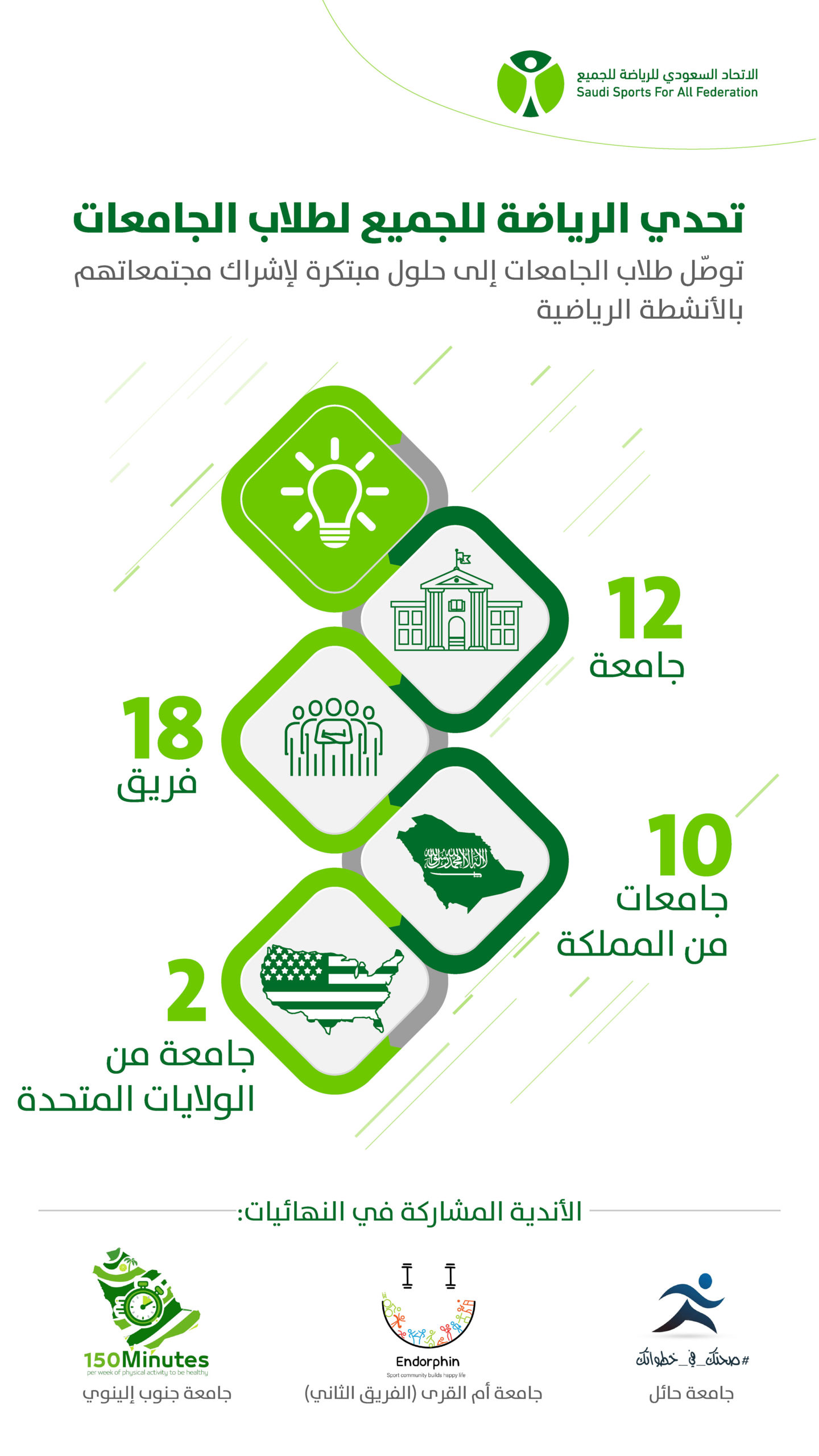 أعلن الاتحاد السعودي للرياضة للجميع اليوم عن أسماء الفرق المرشحة للفوز في المرحلة النهائية في مسابقة “تحدي الرياضة للجميع” لطلاب الجامعات، حيث تتنافس الفرق الثلاثة الفائزة في تطوير نماذج مبتكرة، من شأنها زيادة تفاعل ومشاركة المجتمع في الأنشطة البدنية حيث تبلغ قيمة الجائزة الأولى 10,000 دولار أمريكي، فيما تقدر قيمة الجائزة الثانية بـ 5,000 دولار أمريكي، والجائزة الثالثة بـ 3,000 دولار أمريكي. شهدت مسابقة “تحدي الرياضة للجميع” مشاركة 18 فريقاً من طلاب جامعات سعودية وأمريكية، وذلك من خلال تطوير حملات إبداعية لتشجيع المجتمعات المحلية على المشاركة في مختلف الأنشطة الرياضية، والمساهمة بفعالية إلى تحسين جودة الحياة.