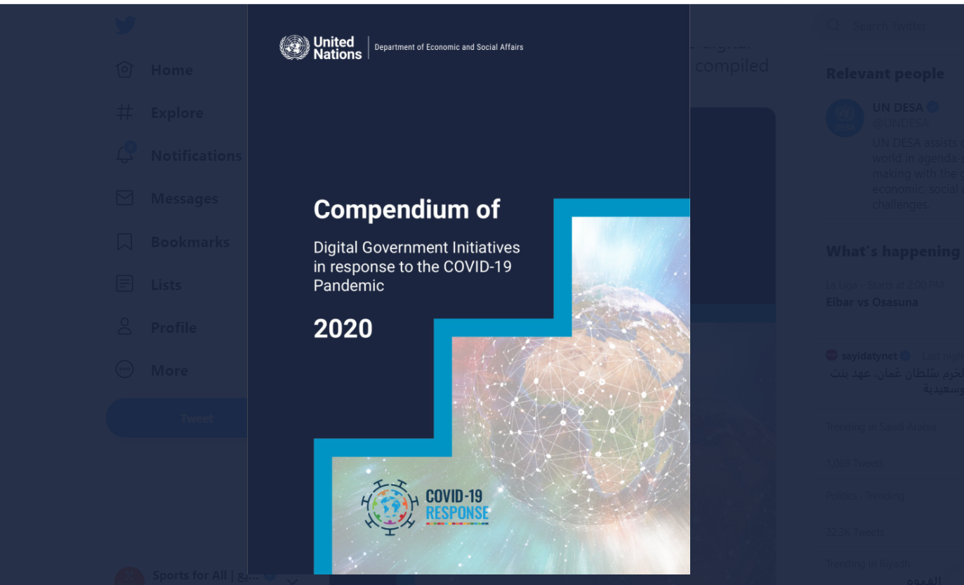 هذا، وقد أصدرت إدارة الأمم المتحدة للشؤون الاقتصادية والاجتماعية (UNDESA) تقريرها بعنوان “مجموعة مبادرات الحكومة الرقمية استجابةً لوباء كوفيد 19″، والذي تم من خلاله تسليط الضوء على ثمانية مجالات رئيسية تتضمن المشاركة الإلكترونية، والصحة الإلكترونية، والأعمال الإلكترونية، والعمل والتعلّم عن بُعد، والسياسة الرقمية، وغيرها.