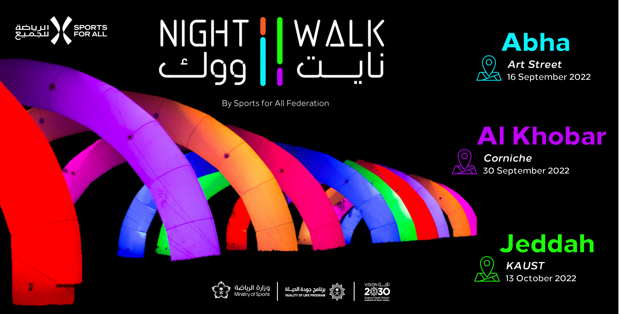 “The Night Walk event is one of the most popular running and walking events globally, whereby people from all age ranges come together to socialize and enjoy the company of their families and friends. We are excited to be hosting this event across multiple areas in the Kingdom, and we are very eagerly looking forward to seeing as many participants as we can,” said Shaima Saleh Al-Husseini, Managing Director of the Saudi Sports For All.